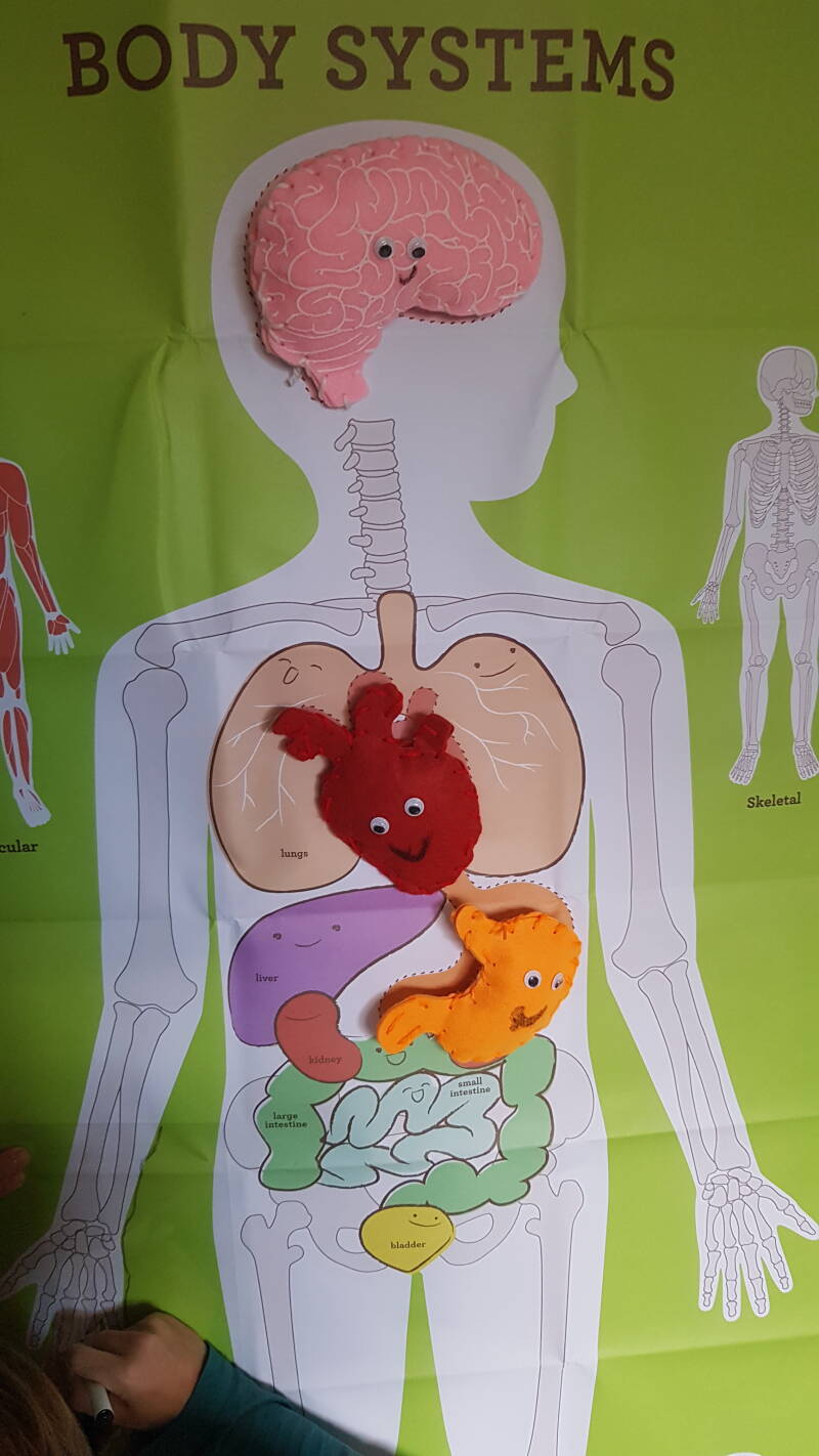 Verder zat er vilt in en naald en draad. Het vilt was gevormd naar de organen. De maag, het hart en de hersens. Julian, Ravian en Florian zijn ermee aan de slag gegaan. Je naait beide delen aan elkaar en vult deze daarna met vulsel. Je mag er oogjes op plakken als je wilt. Ineens hadden we aan tafel chirurgen en werden er hersenoperaties, maagverkleiningen en hart operaties verricht.