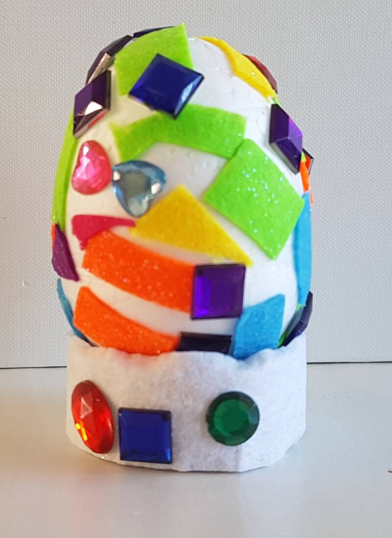 Van piepschuim eieren maakten we, met glitter plakvilt, de mooiste creaties. Erna nog versieren met steentjes en onze eieren waren af.