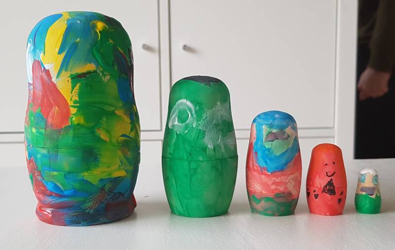Na het bekijken en bespreken van wat we allemaal gezien hebben gaan we door met een verf knutsel. Bij AVA heb ik een houten Matroesjka set gekocht. Het zijn precies 5 poppetjes, dus ieder kan er 1 maken. Ze verven er lustig op los. Als ze droog zijn kunnen we ze in elkaar zetten.