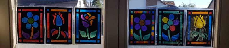 Vandaag hebben we 'glas in lood' bloemen gemaakt voor op het raam. Het zijn eigenlijk hangers maar dat maakt niet uit. Er zitten 6 dubbele sjablonen in een pakje. Het zijn 3 verschillende bloemen. De folie die je nodig hebt om de vakjes te vullen, zitten erbij.