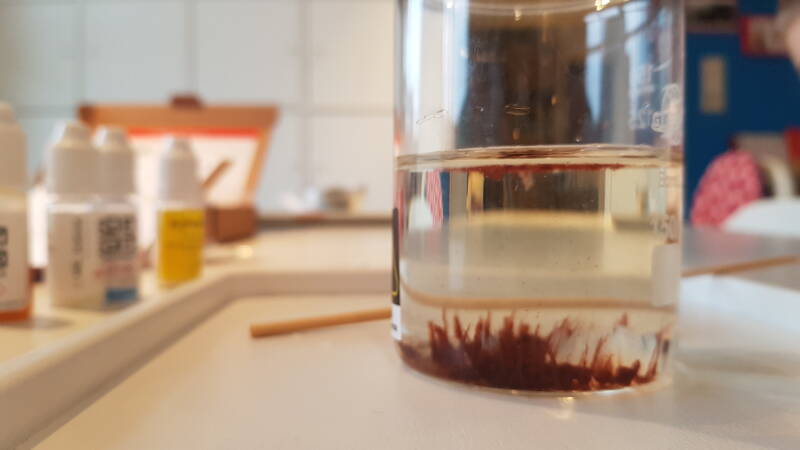 Het was een kwestie van vloeistof in water laten oplossen. Daarna hebben we er korreltjes bij gedaan van o.a. ijzer en zink. Dit groeide uit tot gekke slierten die inderdaad weg hadden van algen.